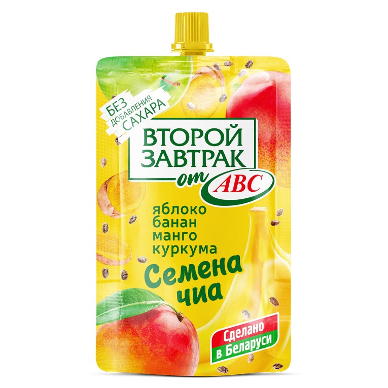 Состав: пюре из яблок (яблоки, антиокислитель аскорбиновая кислота), банановое пюре (бананы, регулятор кислотности лимонная кислота, антиокислитель аскорбиновая кислота), вода питьевая, яблочный концентрированный сок, концентрированное пюре манго, семена чиа, загуститель каррагинан, куркума молотая.